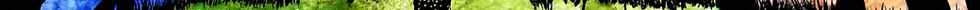 A wildly vibrant sunset seen through dark oak trees reaching toward the sky. Their dark silhouettes frame a meadow where a herd of deer peacefully graze.